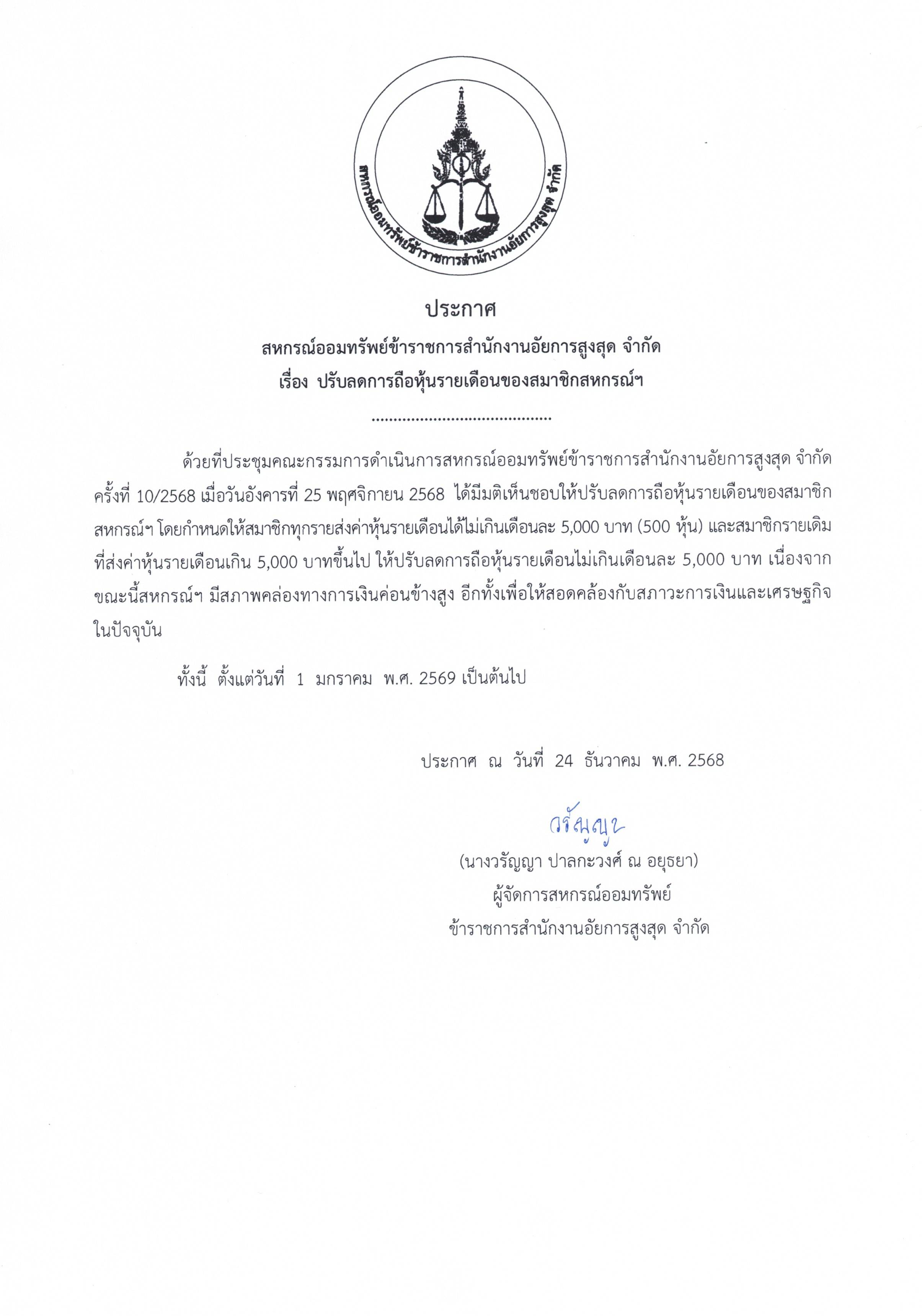 ประกาศ เรื่อง ปรับลดการถือหุ้นรายเดือนของสมาชิกสหกรณ์ฯ