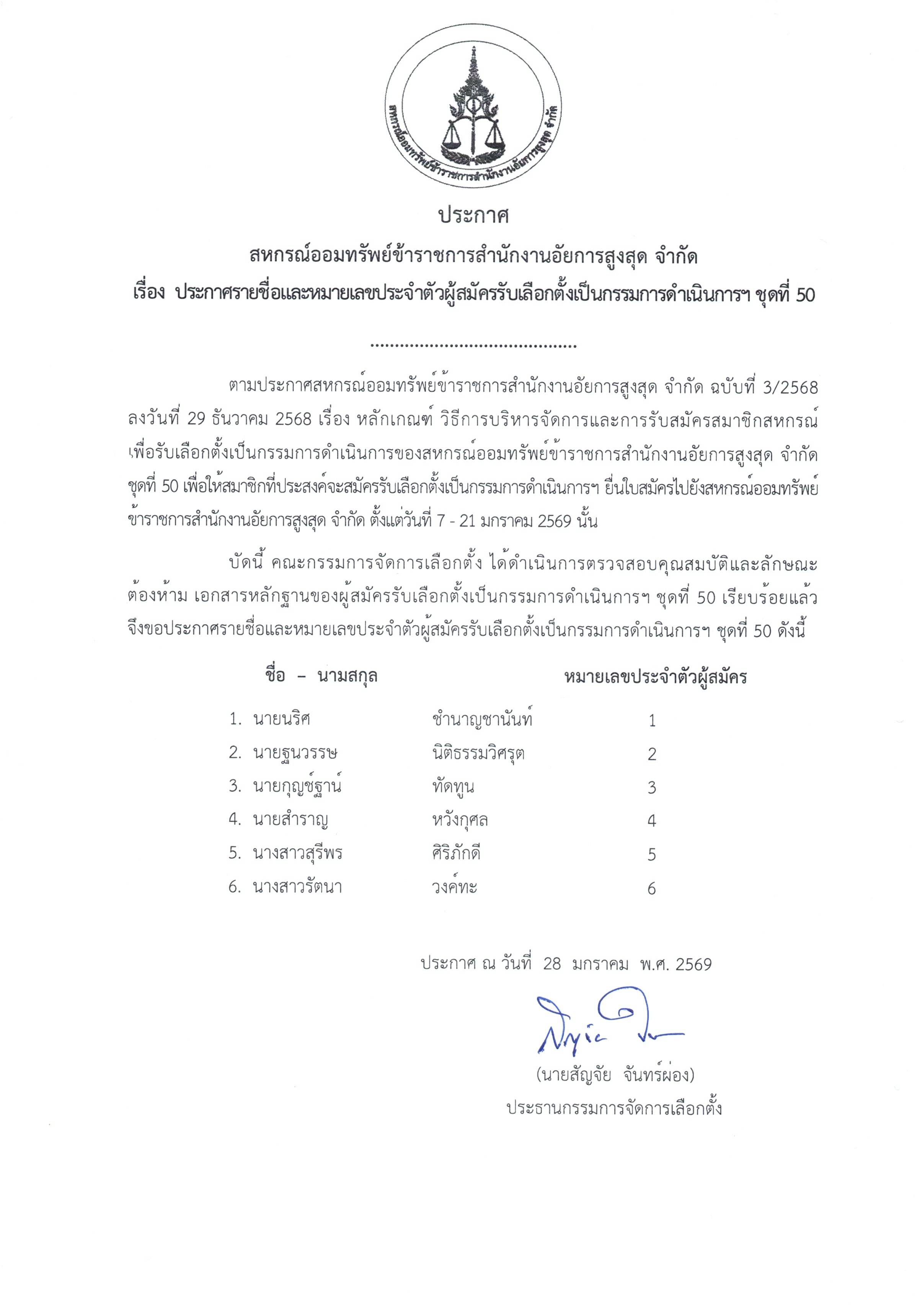 ประกาศ เรื่อง ประกาศรายชื่อและหมายเลขประจำตัวผู้สมัครรับเลือกตั้งเป็นกรรมการดำเนินการ ชุดที่ 50