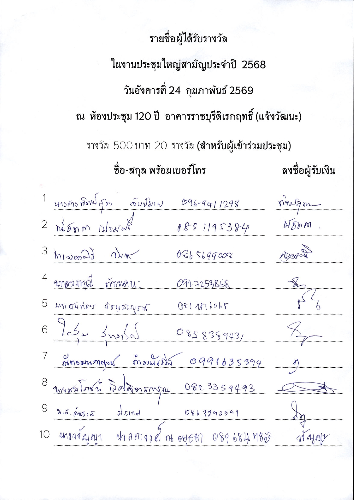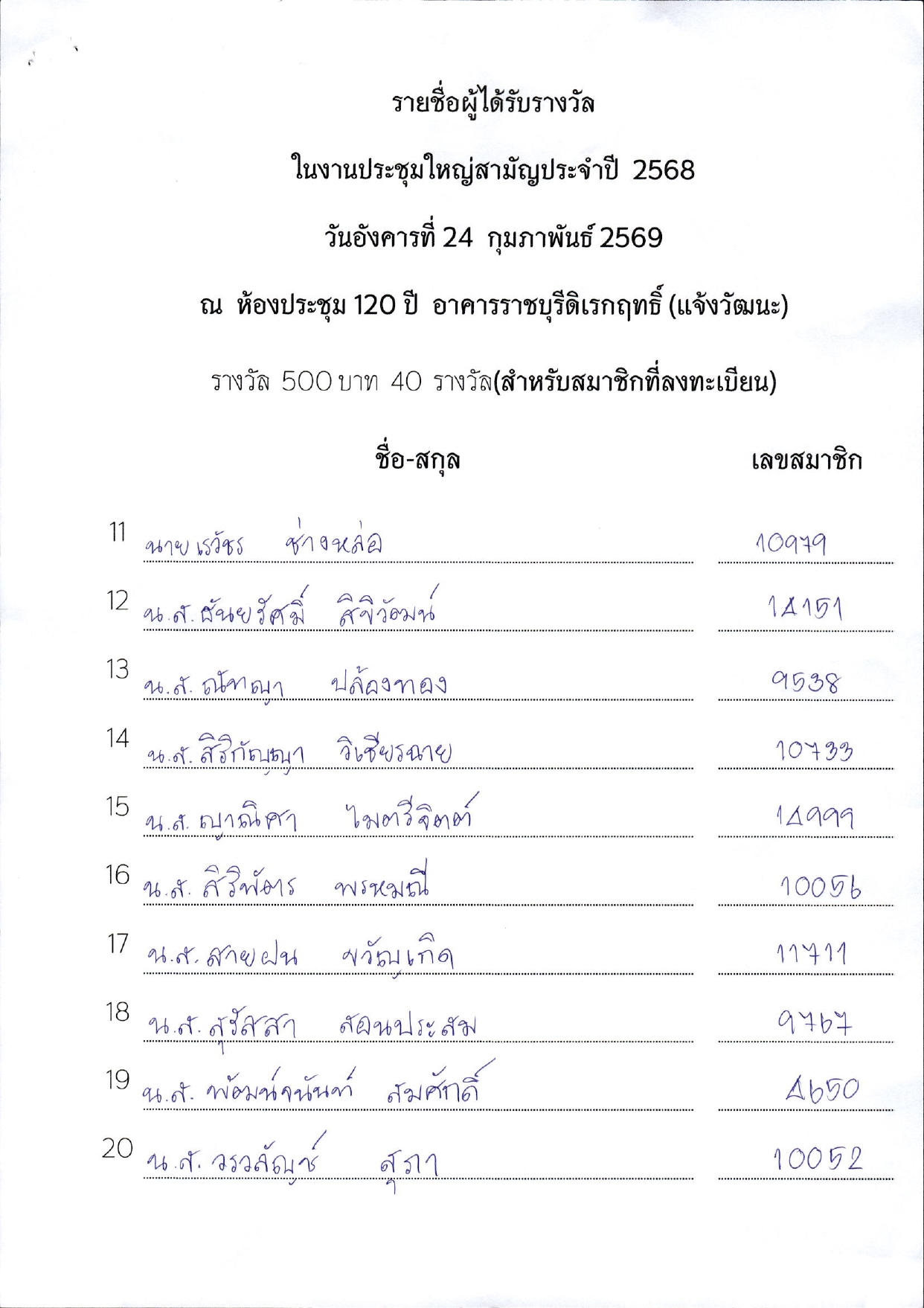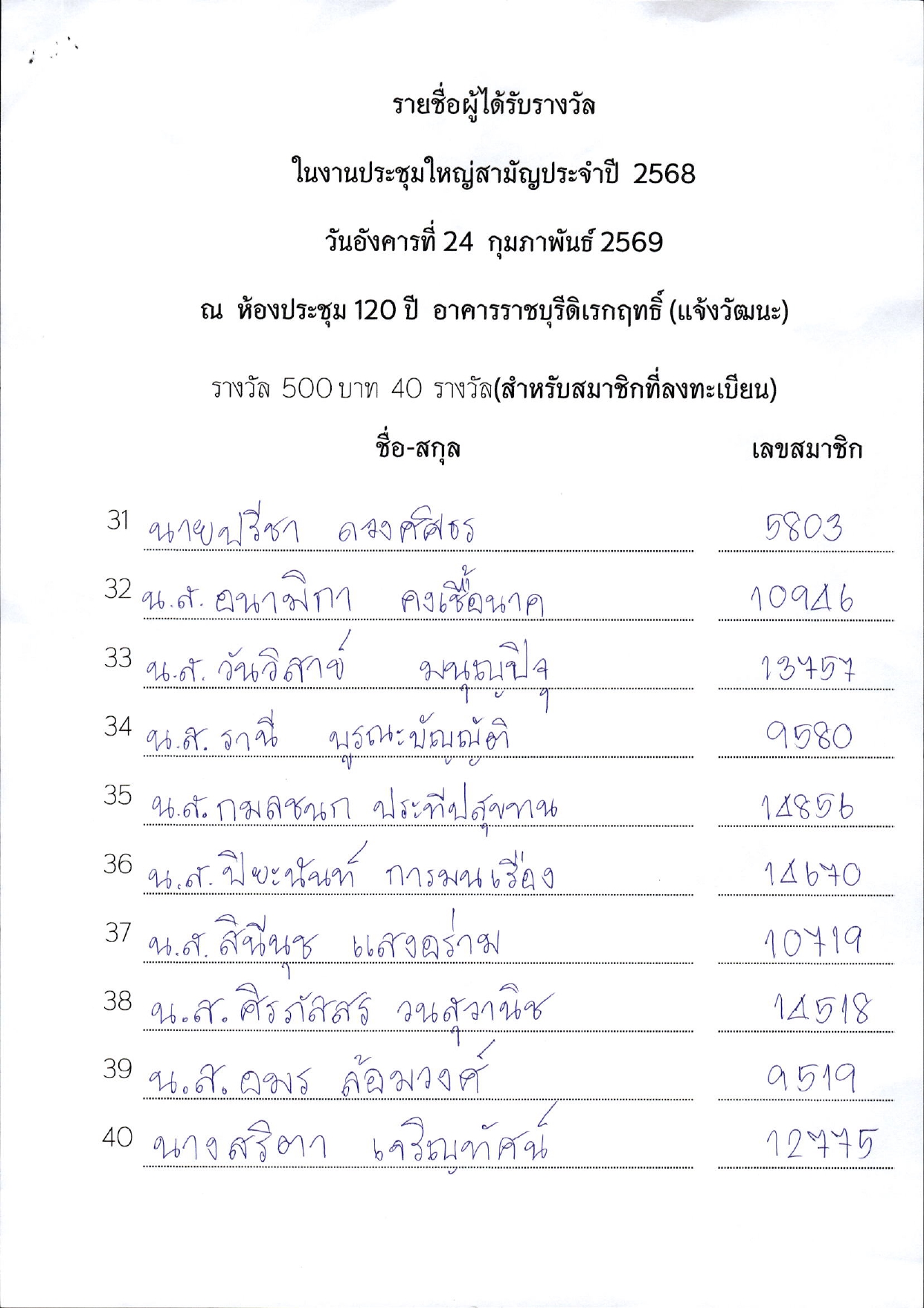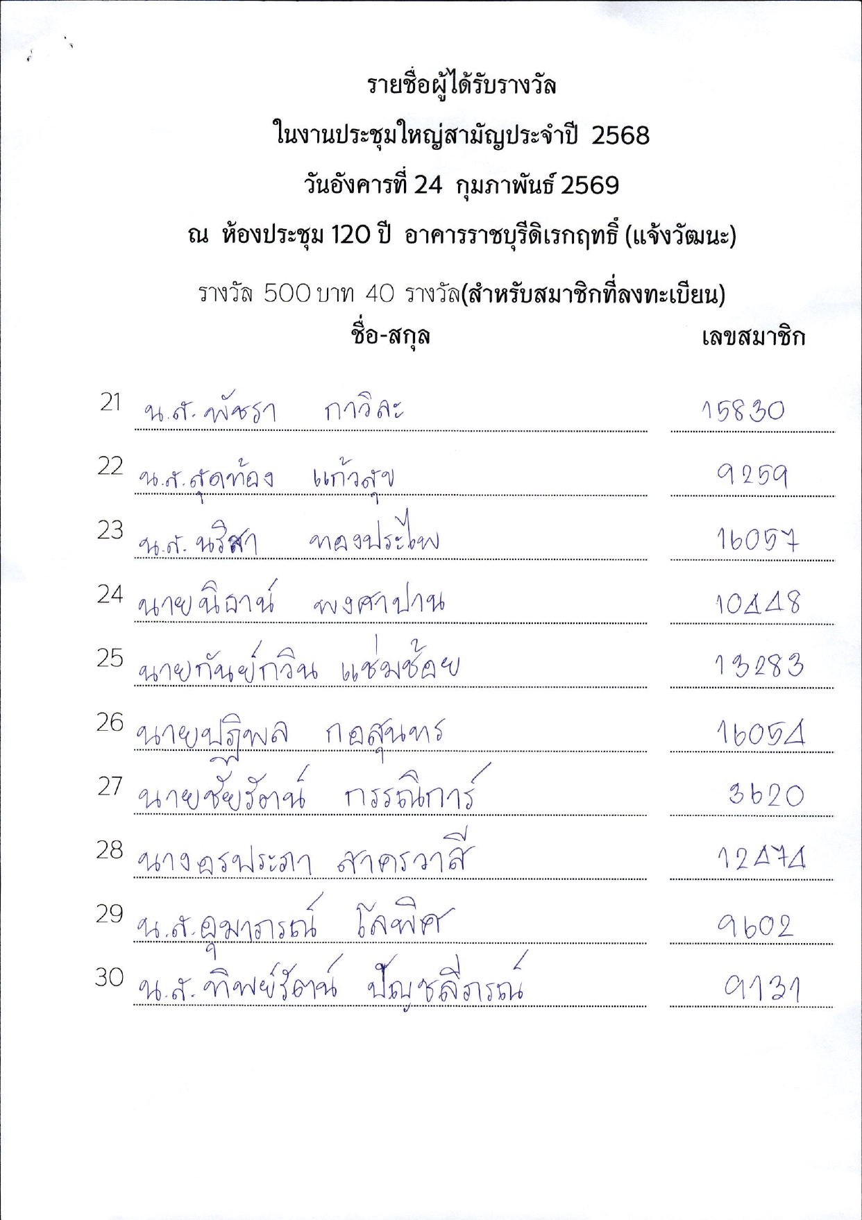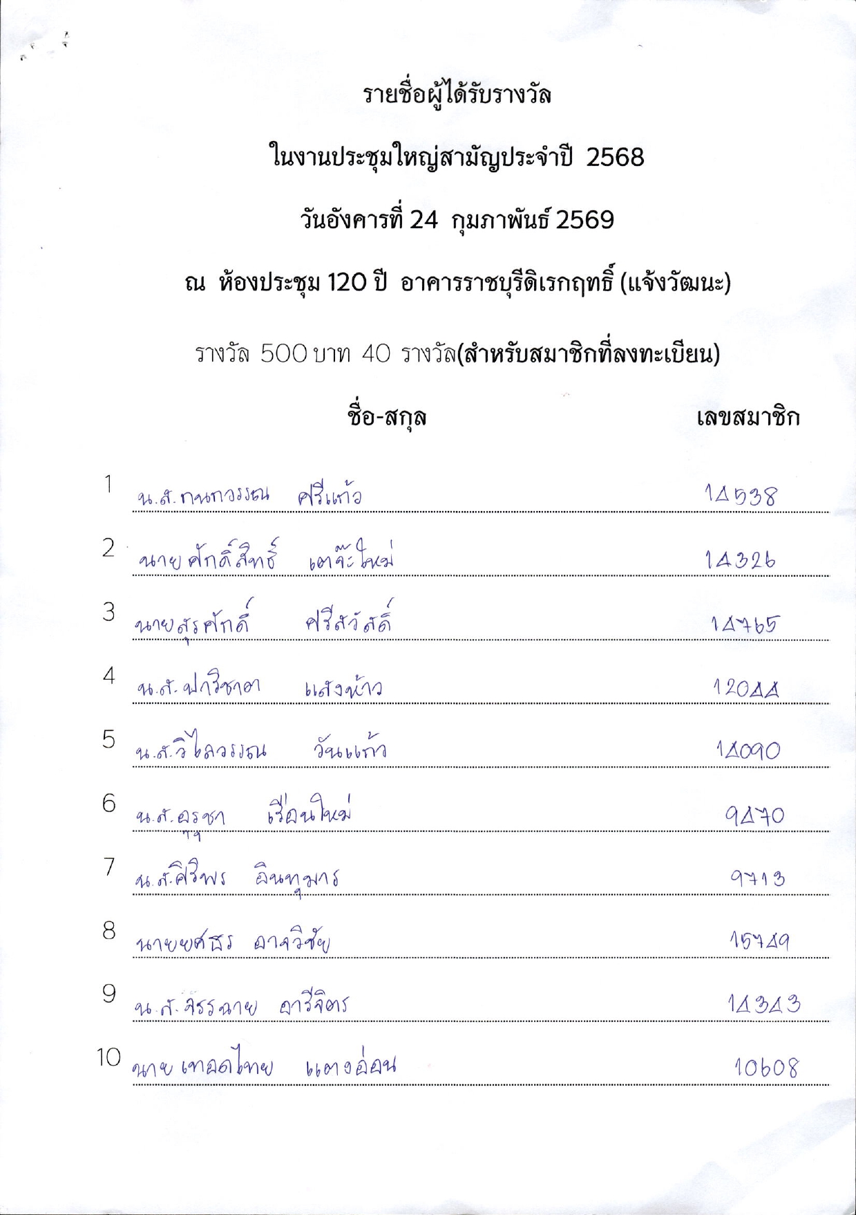 รายชื่อผู้ได้รับรางวัลในงานประชุมใหญ่สามัญประจำปี 2568