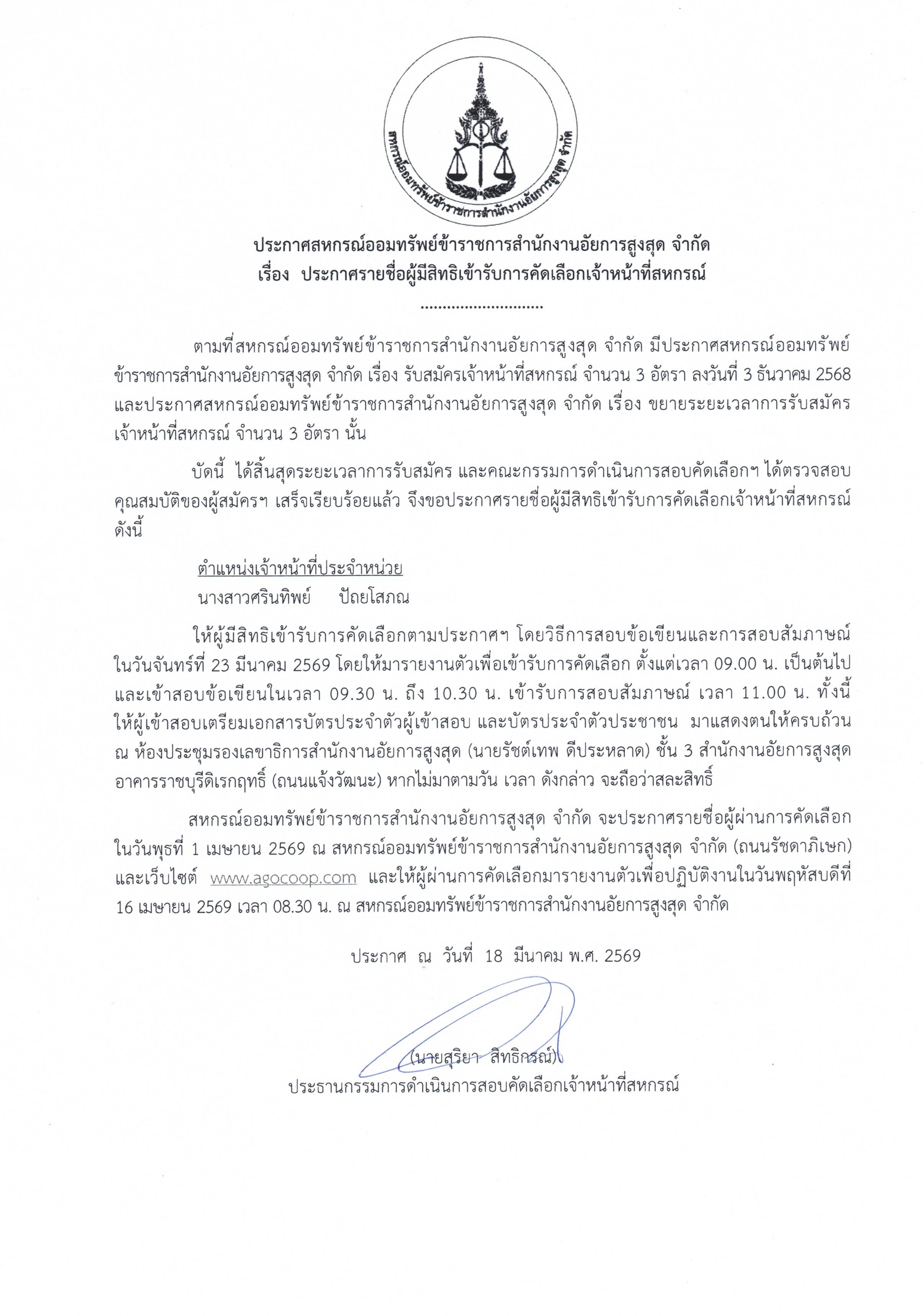 ประกาศ เรื่อง ประกาศรายชื่อผู้มีสิทธิเข้ารับการคัดเลือกเจ้าหน้าที่สหกรณ์
