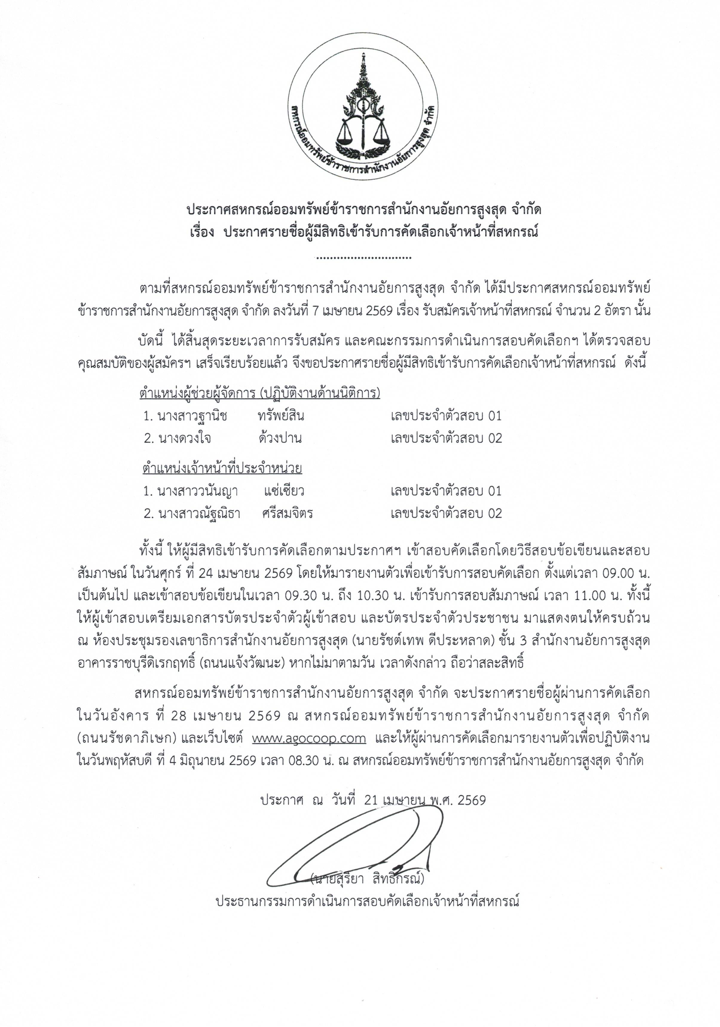 ประกาศ เรื่อง ประกาศรายชื่อผู้มีสิทธิเข้ารับการคัดเลือกเจ้าหน้าที่สหกรณ์