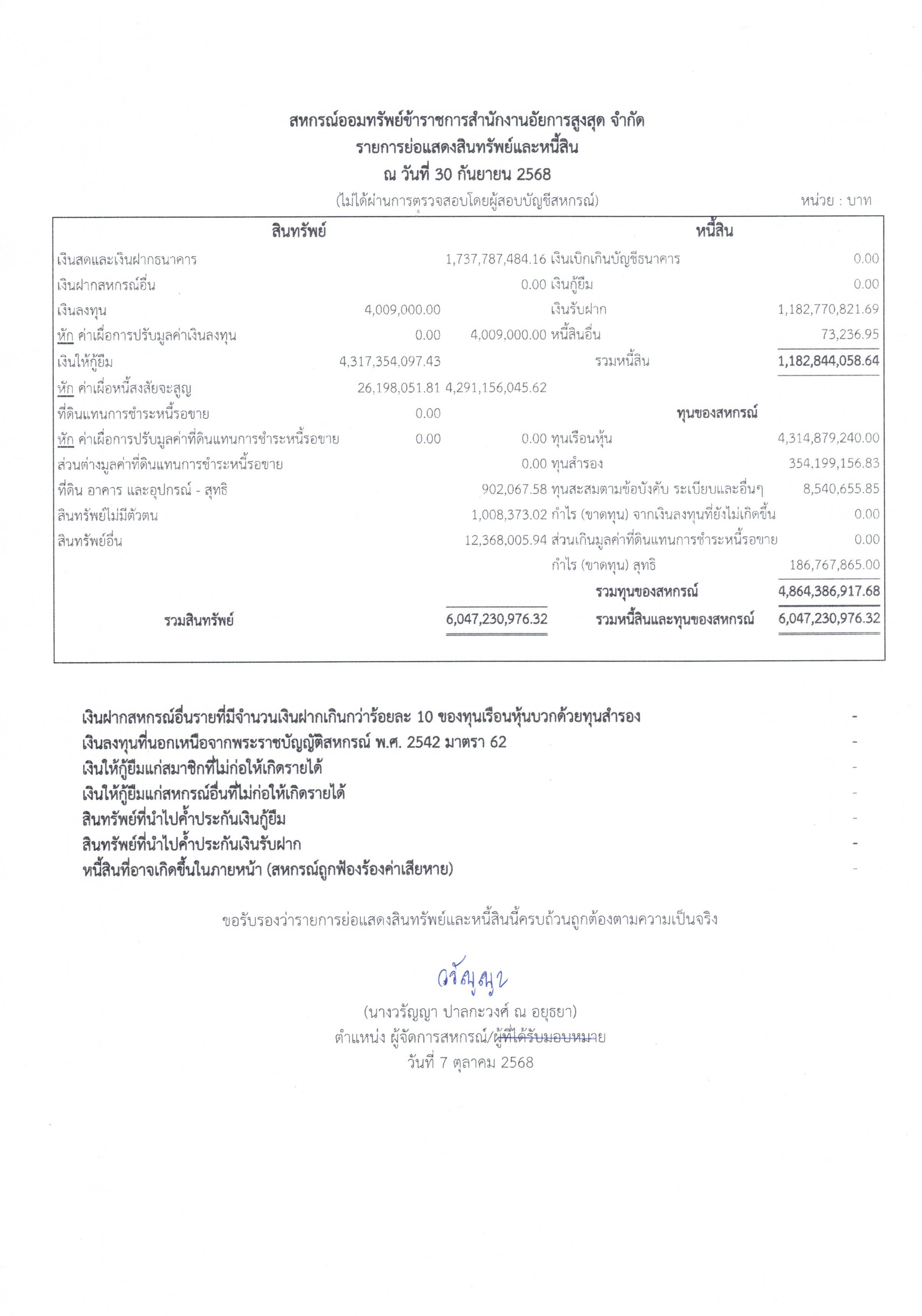 รายการย่อแสดงทรัพย์สินและหนี้สิน ณ วันที่ 30 กันยายน 2568