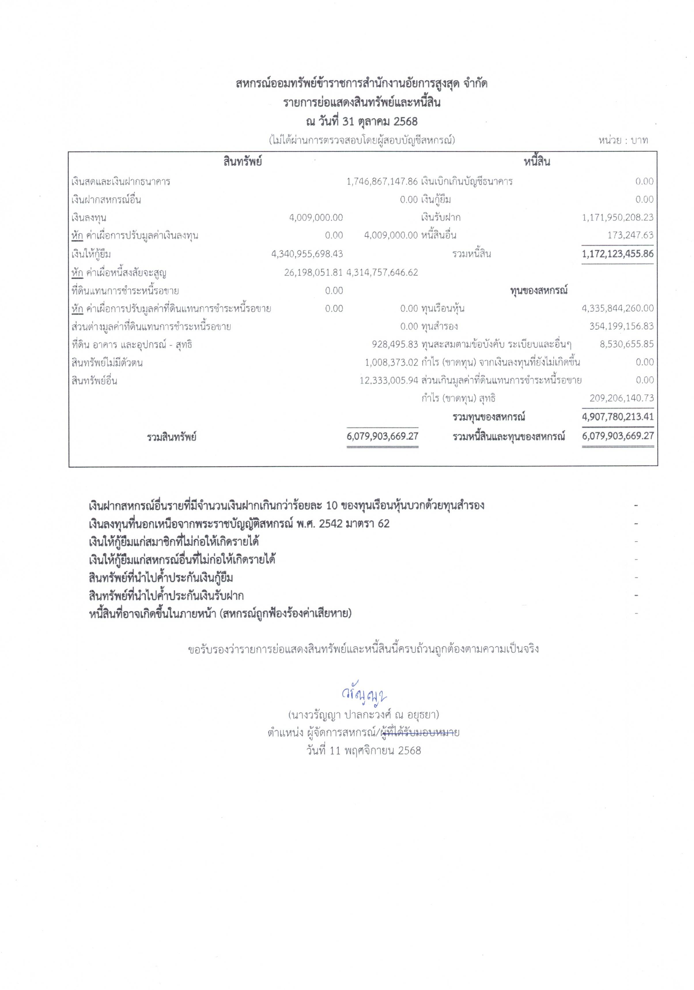 รายการย่อแสดงทรัพย์สินและหนี้สิน ณ วันที่ 31 ตุลาคม 2568