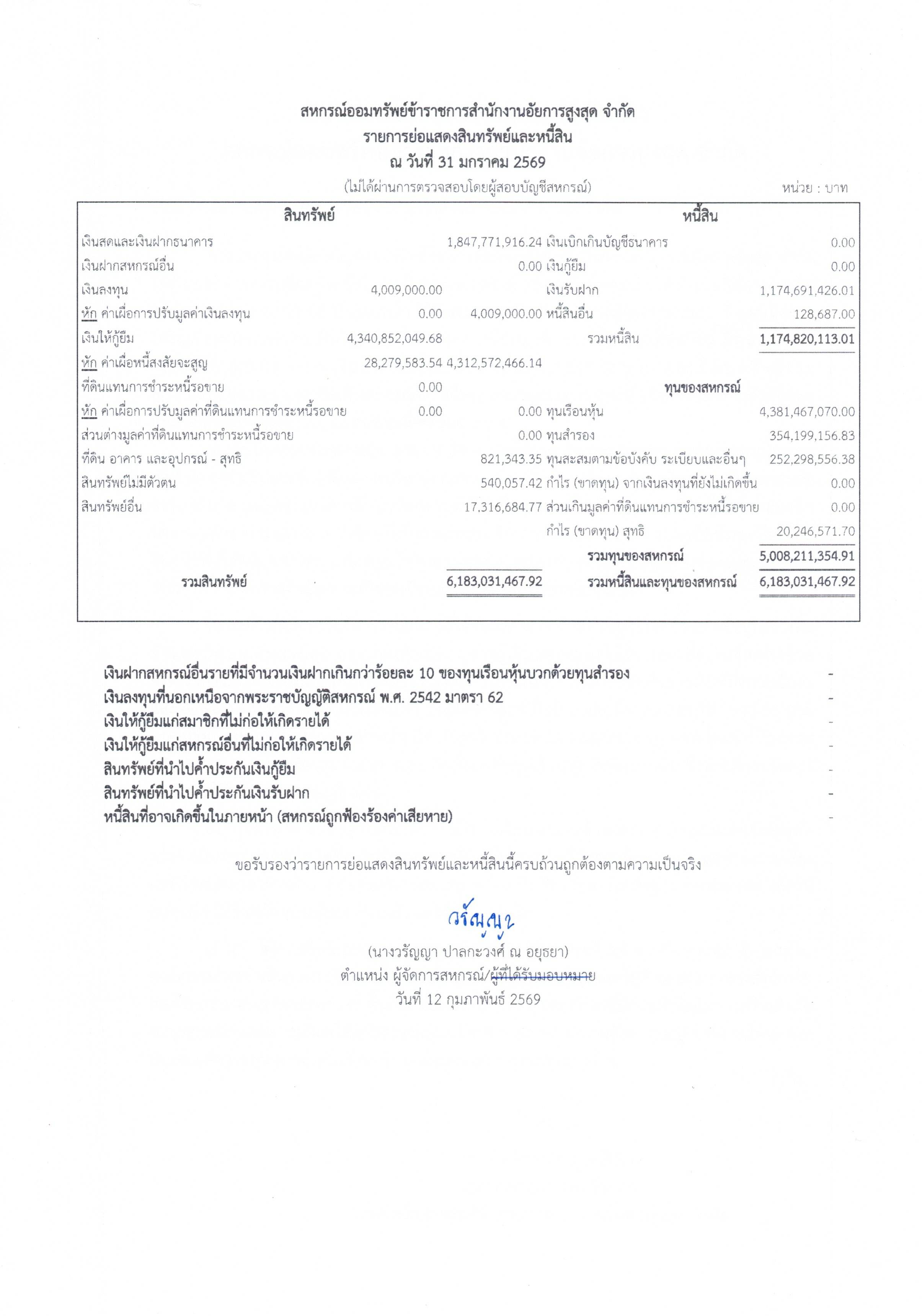 รายการย่อแสดงทรัพย์สินและหนี้สิน ณ วันที่ 31 มกราคม 2569