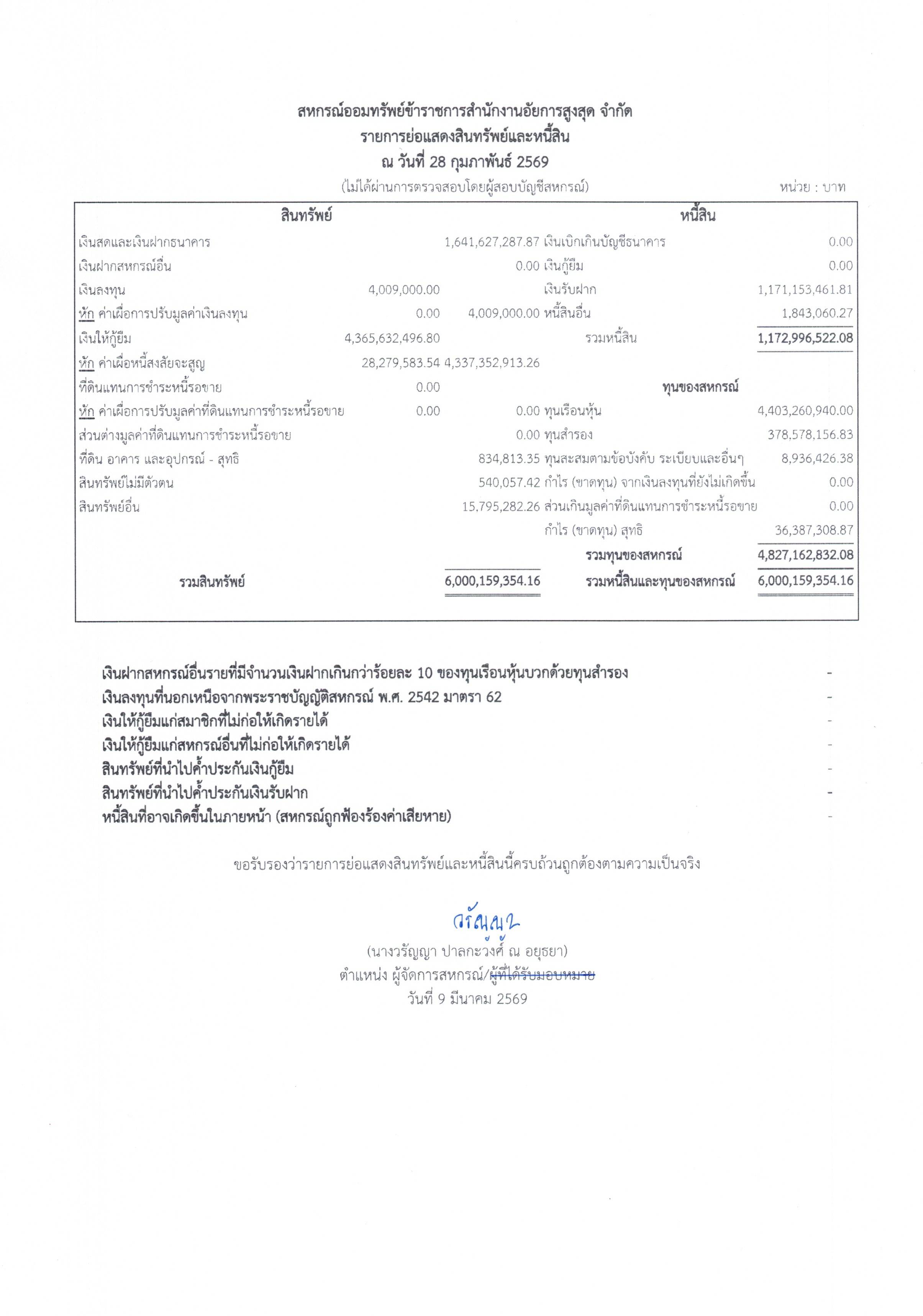 รายการย่อแสดงทรัพย์สินและหนี้สิน ณ วันที่ 28 กุมภาพันธ์ 2569